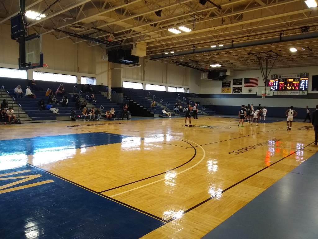 I chatted with the school’s custodian on my way out of the gym and he told me that Lesley paid to put down a full hardwood court to keep in line with NCAA guidelines as MHS had a rubber court. The track surrounding the court is still rubber.