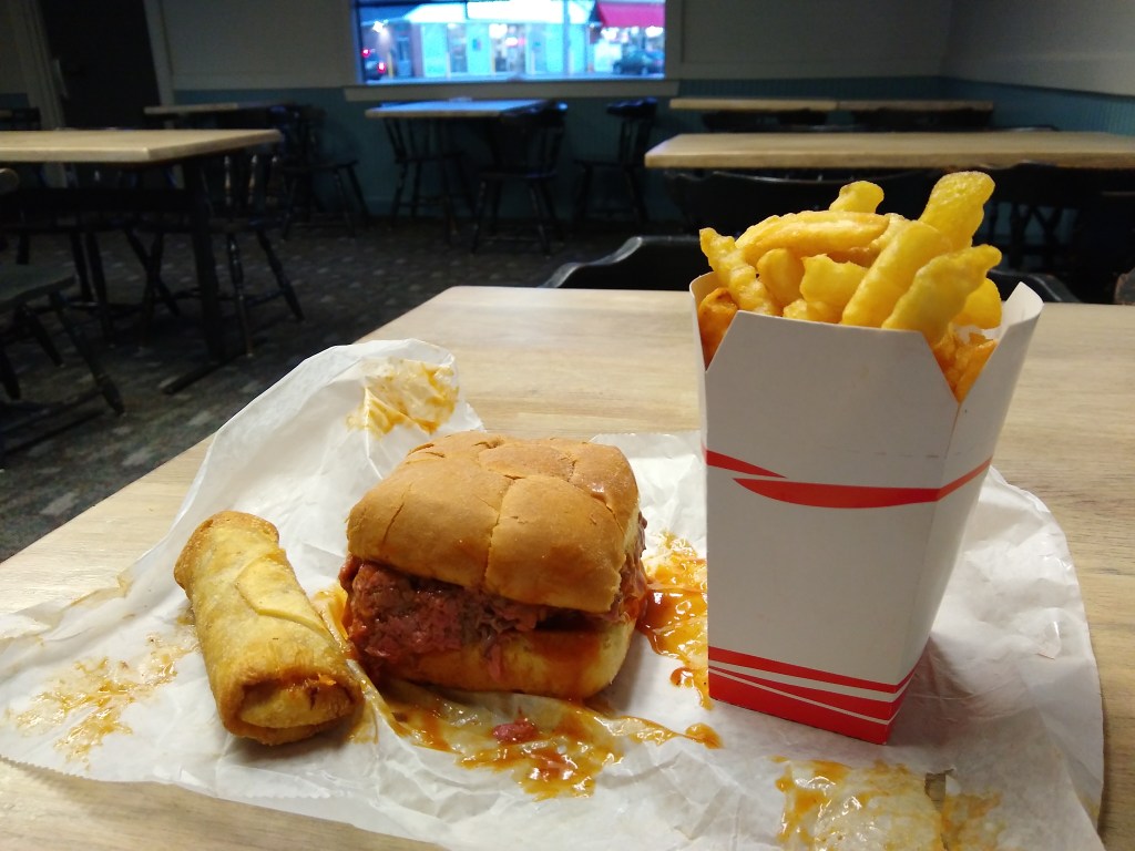 My go-to is always the same. A large roast beef with cheese, medium fry, pizza roll, and diet Pepsi. It never fails to satisfy. There is no ambience here. You don’t come to dine. You come to put roast beef in your face.