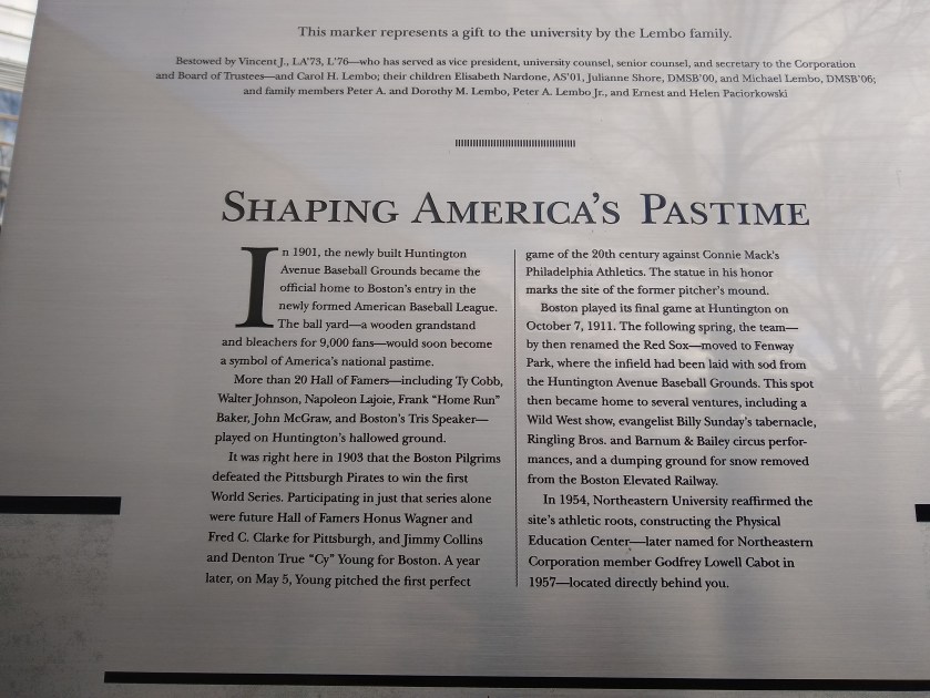 This was the site of the Huntington Avenue Ground, the original home of the Boston Americans baseball team. Today the club is better known as the Red Sox. The Grounds hosted the first World Series in 1903, in which Young led the Americans to a 5-3 series win over the Pittsburgh Pirates.