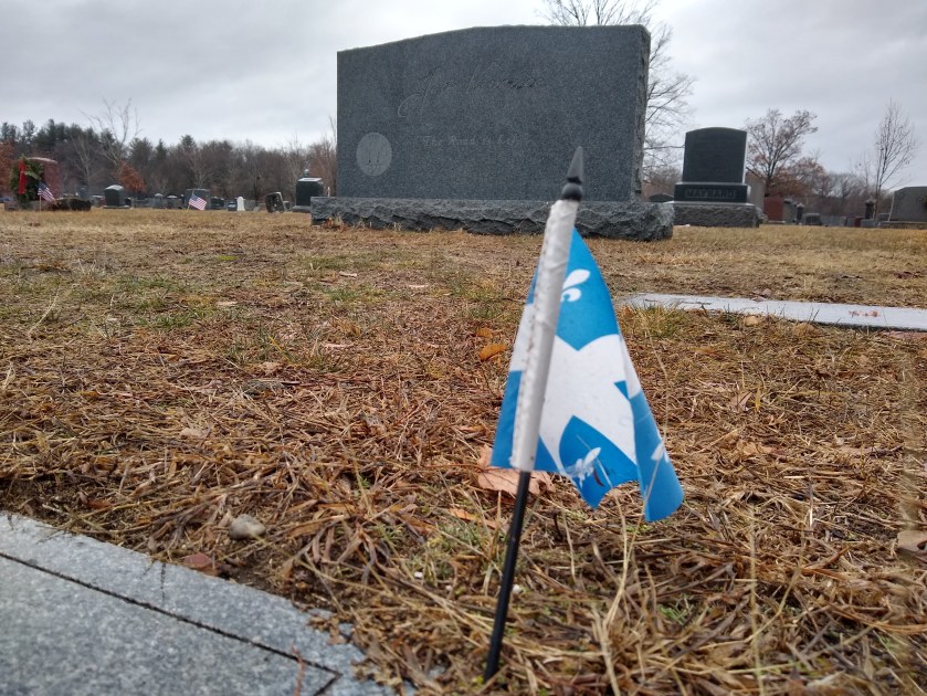 The small flat stone sits a few yards in front of a more robust stone with the simple inscription “The Road is Life.” A small Fleurdelisé adorns his grave in honor of his Quebecois heritage.