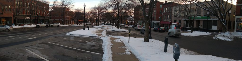 Full of shops, eateries, and everything else a college town needs, Central Square is perfectly New England from the coffee shops to the old mainline Protestant Church as its focal point.
