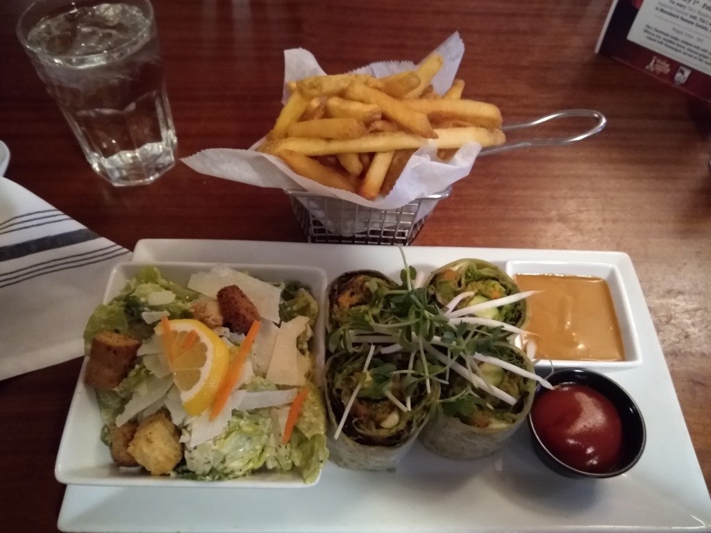 Called a California wrap & roll, it was a veggie burger wrapped with a dill-infused Havarti, avocado, bean sprouts, and field greens dressed in a carrot ginger sauce. And it came with a tamari peanut sauce.