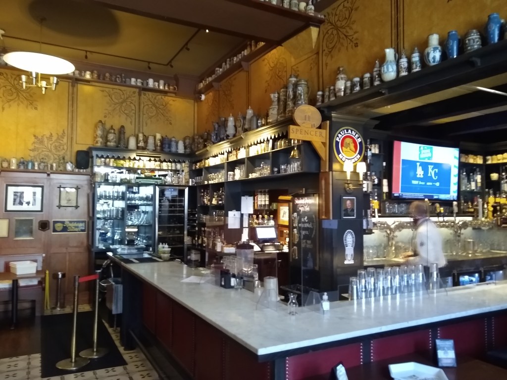 Visually, the restaurant is striking for its endless drinking ephemera. Hundreds of beer steins sit above the bar and the tables, and a huge collection of bottle openers are displayed along the walls of the restaurant.