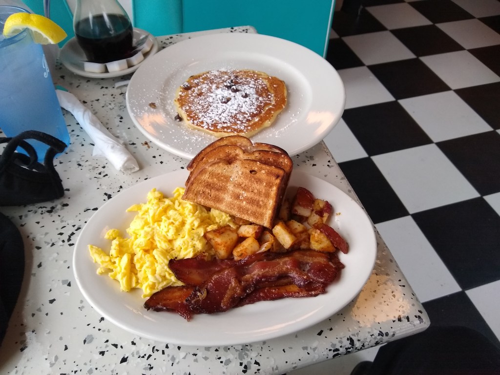 It was breakfast so I kept it simple, the two egg combo with home fries, multigrain, and bacon. And I always add a single chocolate chip pancake at the diner.