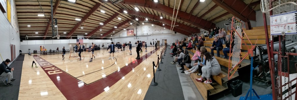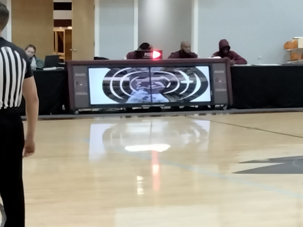 The gym had, without question, the strangest video board I’d ever seen. It was on the front of the scorer’s table and just cycled through a hand full of graphics and promotional ads for the school.