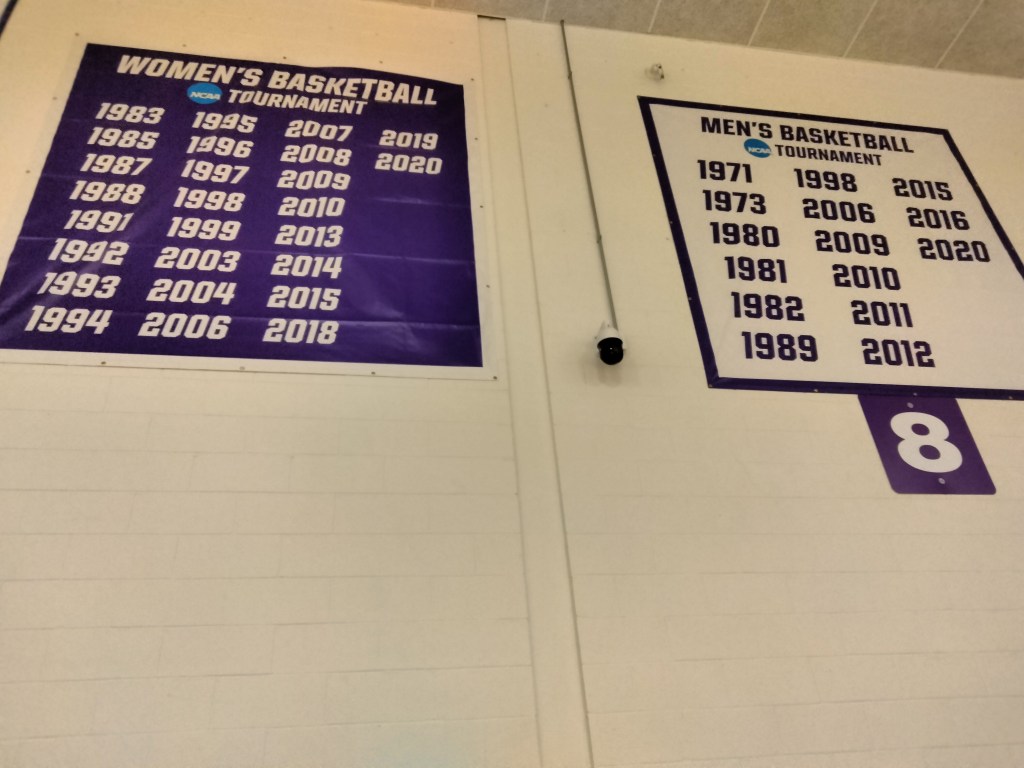 It’s not a big gym, with a capacity of just 1,560. It’s tight and cozy. All of the seats are just purple bleachers. No seats have chairbacks.