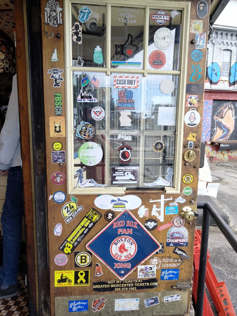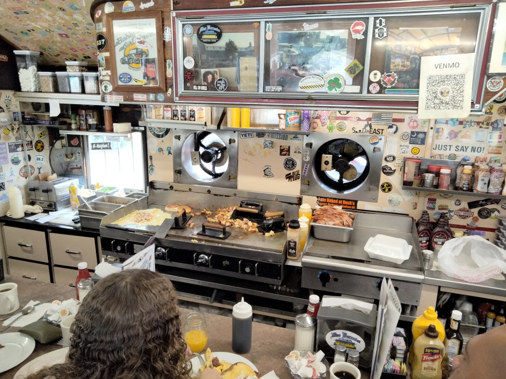 The vibe of the diner starts with the front door which, like the rest of the place, is covered in stickers.