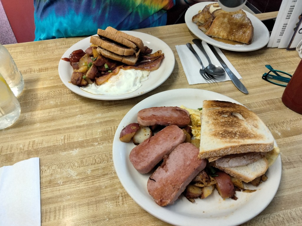 The Polynesian was eggs, toast, home fries, but instead of bacon or sausage it was Spam, which I had never had before. Oh, and I added a chocolate chip pancake like I always do, which was big and fluffy and amazing.