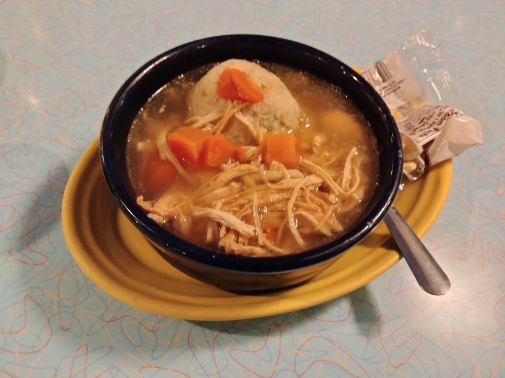 I got me a bowl of that delicious soup, and it lived up to the hype. Nothing messes up a soup like underseasoning, but this was salted perfectly and stuffed full of noodles and veggies to go with a baseball-sized matzo ball.
