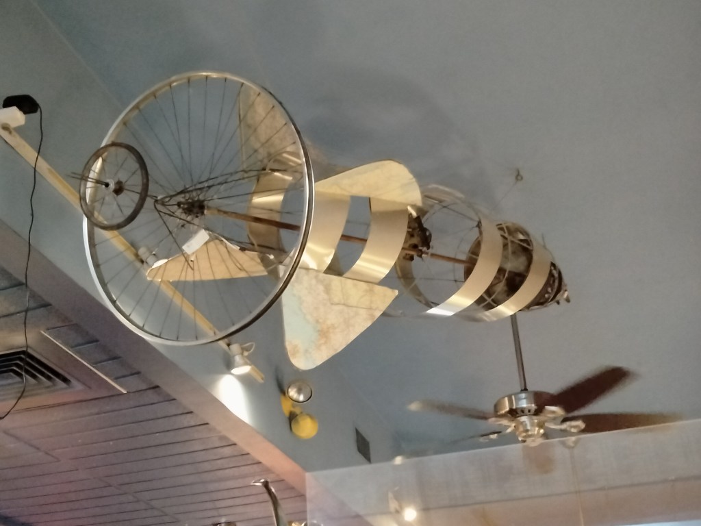 My fraternity brother and I snagged a booth and hunkered in under a blimp? A general flying machine? A sculpture? You decide.