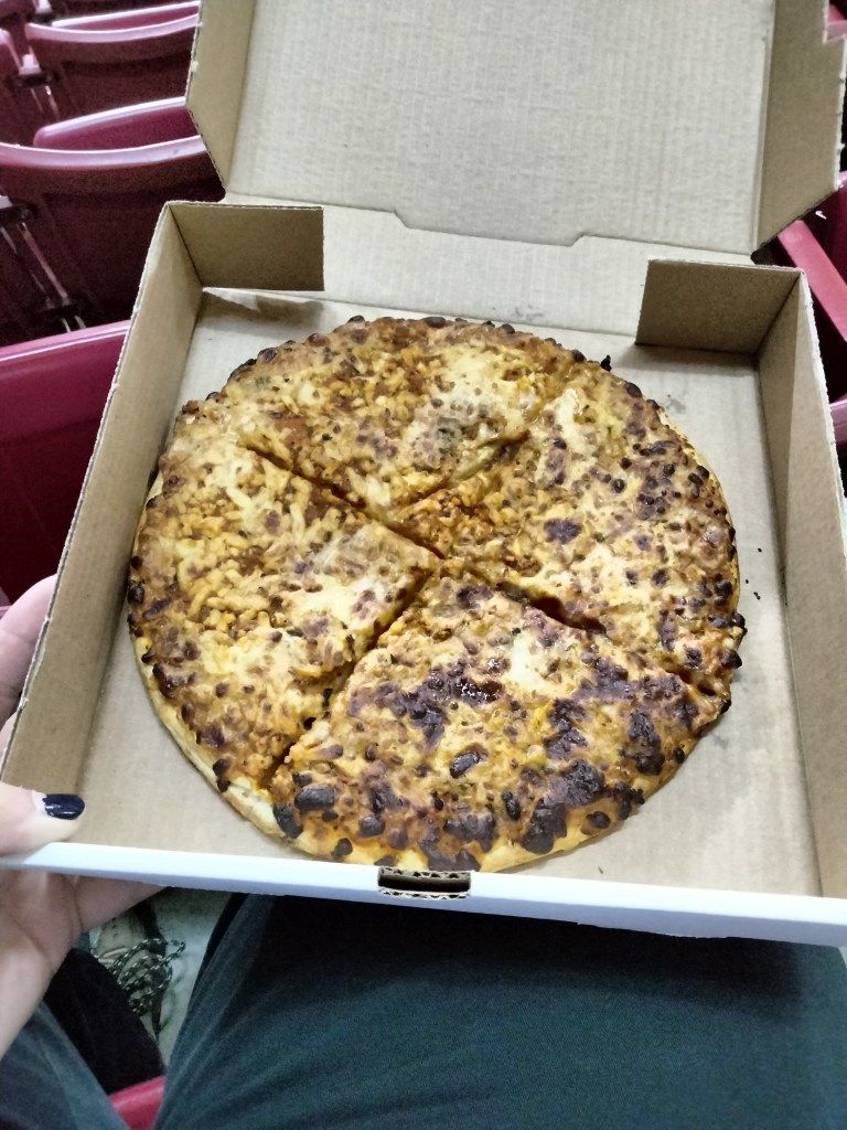 The guy at the counter said that all food purchased before the game is half-priced. There’s no signage saying that in the building, but it is an excellent tip to know. And the pizza was pretty solid.