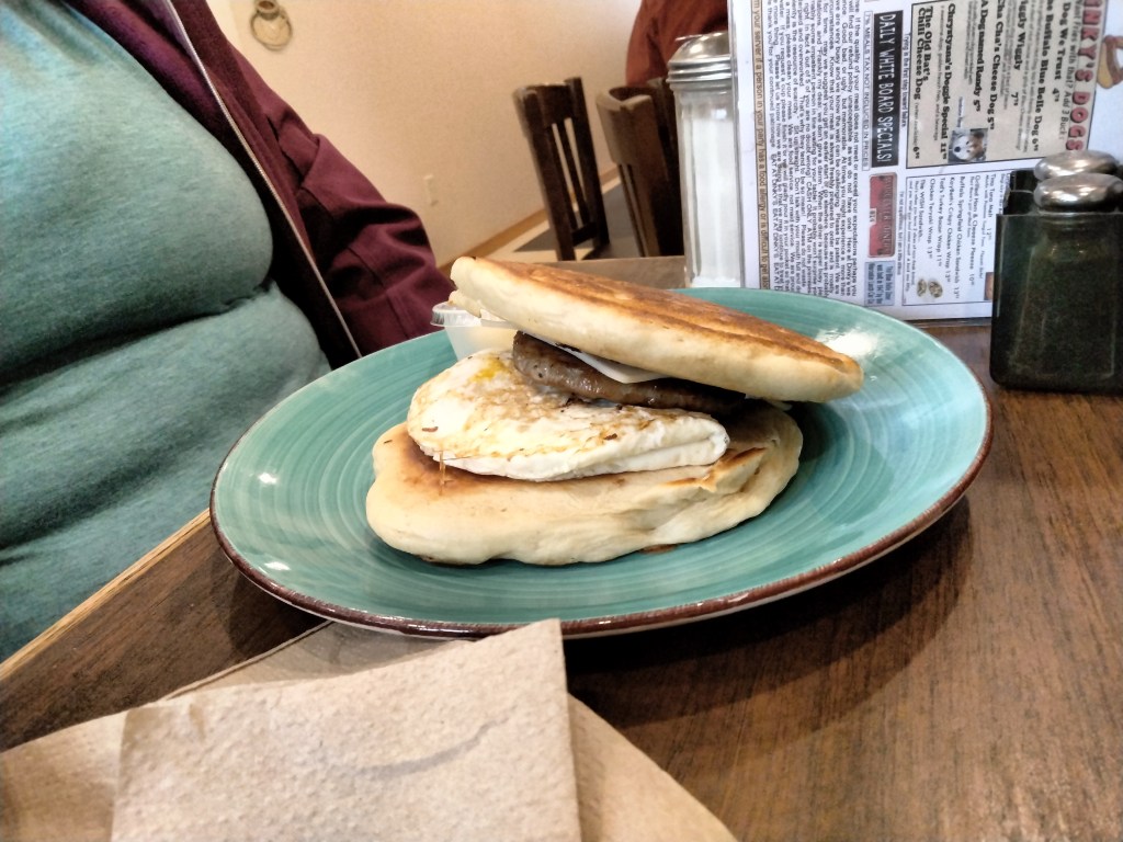 My wife went for Stephanie’s Panwich, which is a sausage, egg, and cheese sandwich on pancakes. She separated it and ate it separately but it certainly was a unique sandwich.