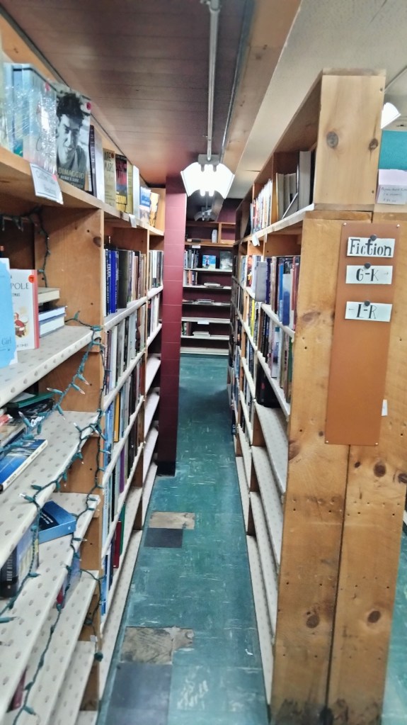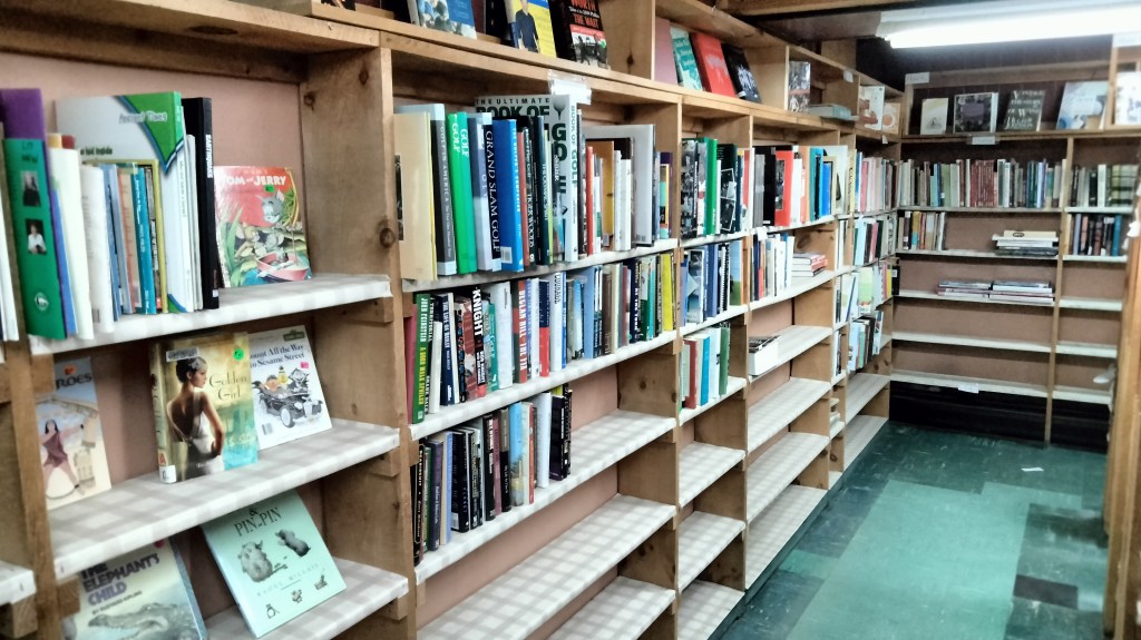 Downstairs there was a bookstore with floor-to-ceiling shelves of all genres.