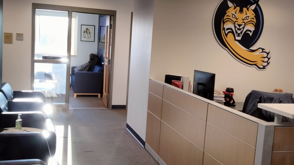 You see the two wings of the building. The left is for basketball and the right is for hockey. Many banners hung throughout town celebrating the men’s hockey national title in 2023.