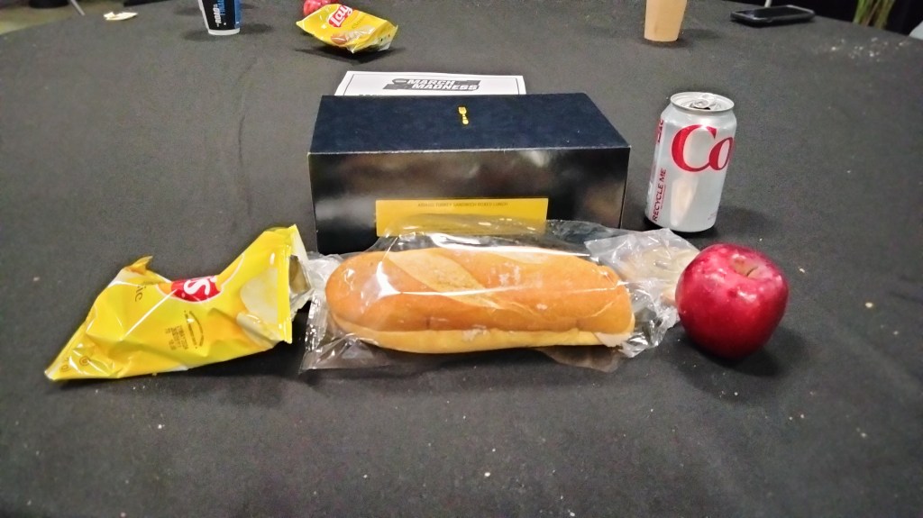 That was it. It was served from 12-2 and no other meals provided all day. The sandwich, turkey with caramelized onions and asiago, was fine. Those Lay’s chips are the single worst chip on the market not named Pringles. The cookie? Excellent. The apple? Didn’t have it.