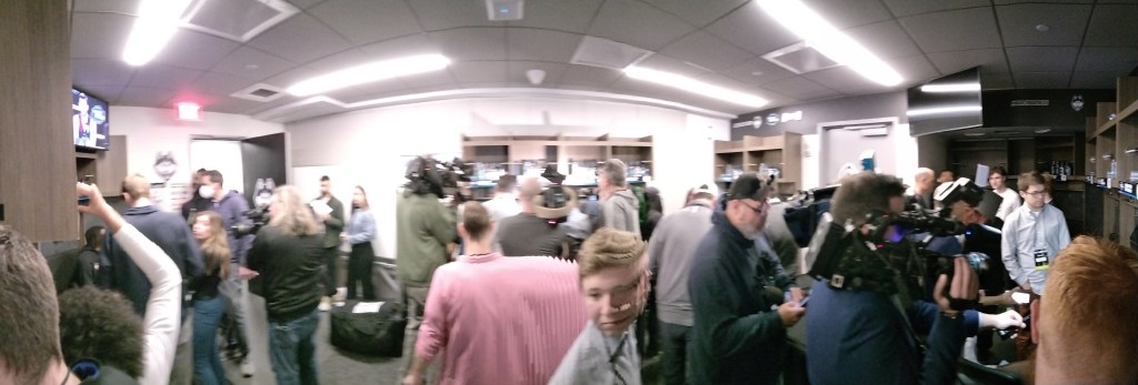 Being a local reporter, UConn was my top target of the weekend. So when locker rooms opened I went over. Of course, I wasn’t alone. It was like a phone booth in so many ways. Luckily I was able to get some time to talk with Solomon Ball. Lovely person.