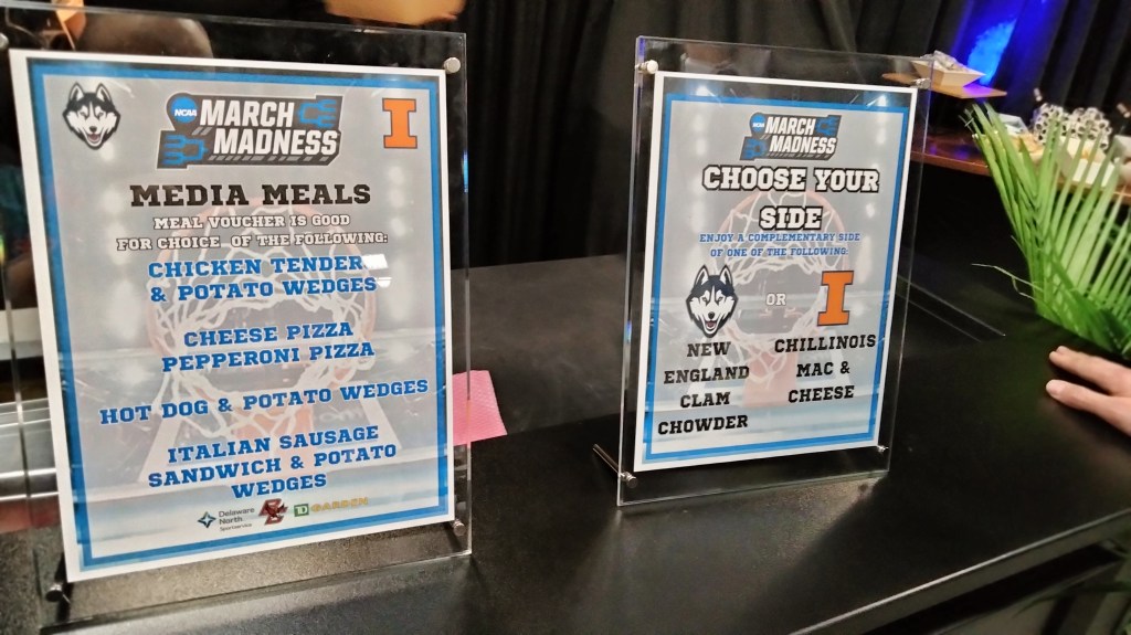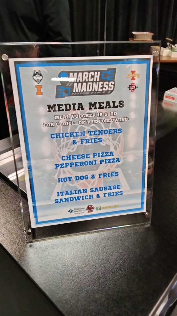 Speaking of eating, let’s talk about the food. I’ve covered numerous D1 NCAA tournaments. I’ve done them here at the Garden, at the Ryan Center at URI, the XL Center in Hartford, Gillette Stadium, and the Paycom Center in Oklahoma City. One of the consistents at all of them was a buffet for media.