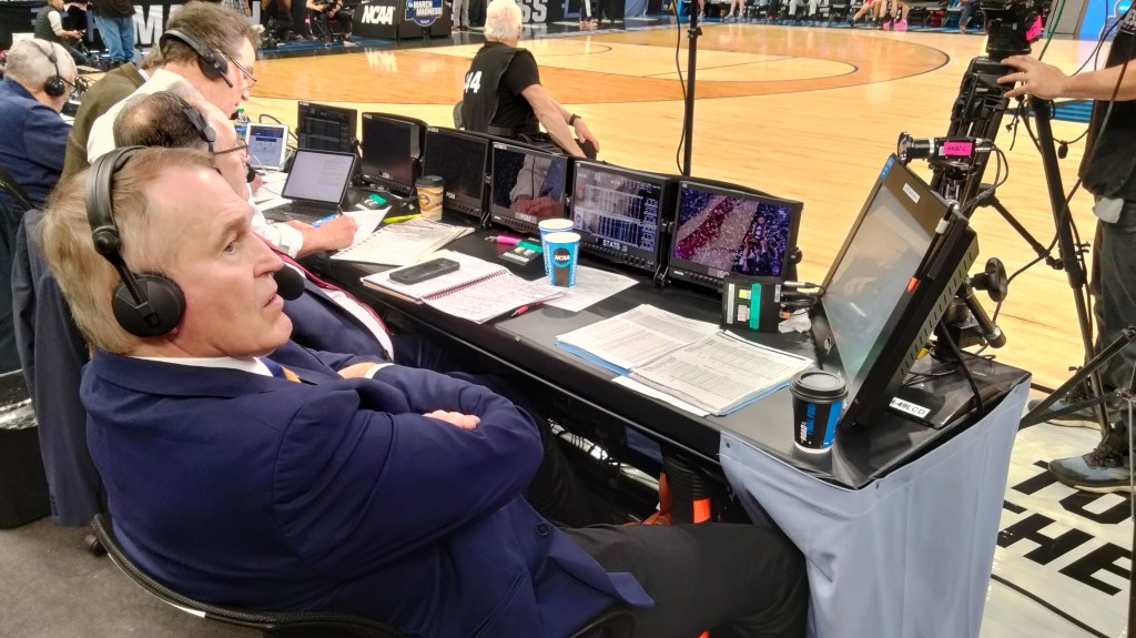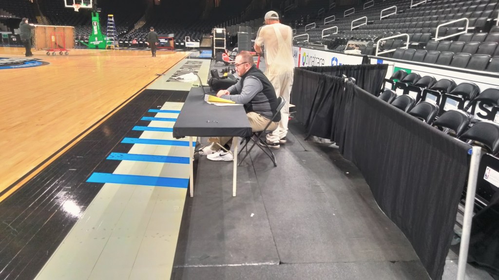 After eating and catching up with some old friends, I hit the floor to see what was going on pregame as the fans being to trickle in. I was able to snap a shot of the TV booth as they were prepping for pregame. As someone who broadcasts himself, both at the D3 level and at low-major D1 schools, I’m used to having a talkback box and a replay monitor for a D1 game. That’s it. Simple. For D3s I’m just flying freelance with a microphone and a broadcast partner.