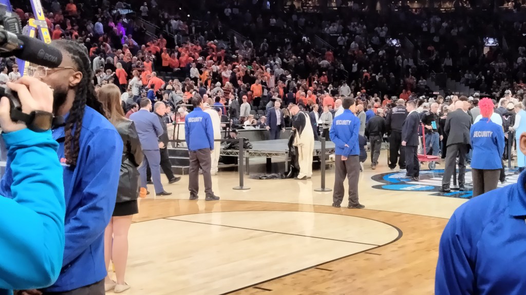 After a relatively muted celebration by the the team on the court the postgame festivities got underway. First, a swarm of blue-shirted security staff scurried onto the floor and encircled the three-point line at one end as the ladder was set up for the net cutting. At the same time, a different team scampered out to midcourt to set up the stage that would be used for the regional trophy presentation.