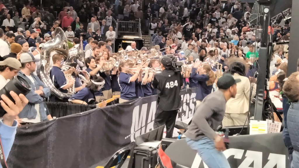 What I do know is that the game is better presented in college. There’s no graphic clamoring to MAKE SOME NOISE or stating DEEE FENSEEEE. There’s no music or other audio piped in during the games. The amassed humanity is the soundtrack, and those pep bands are always a gem.