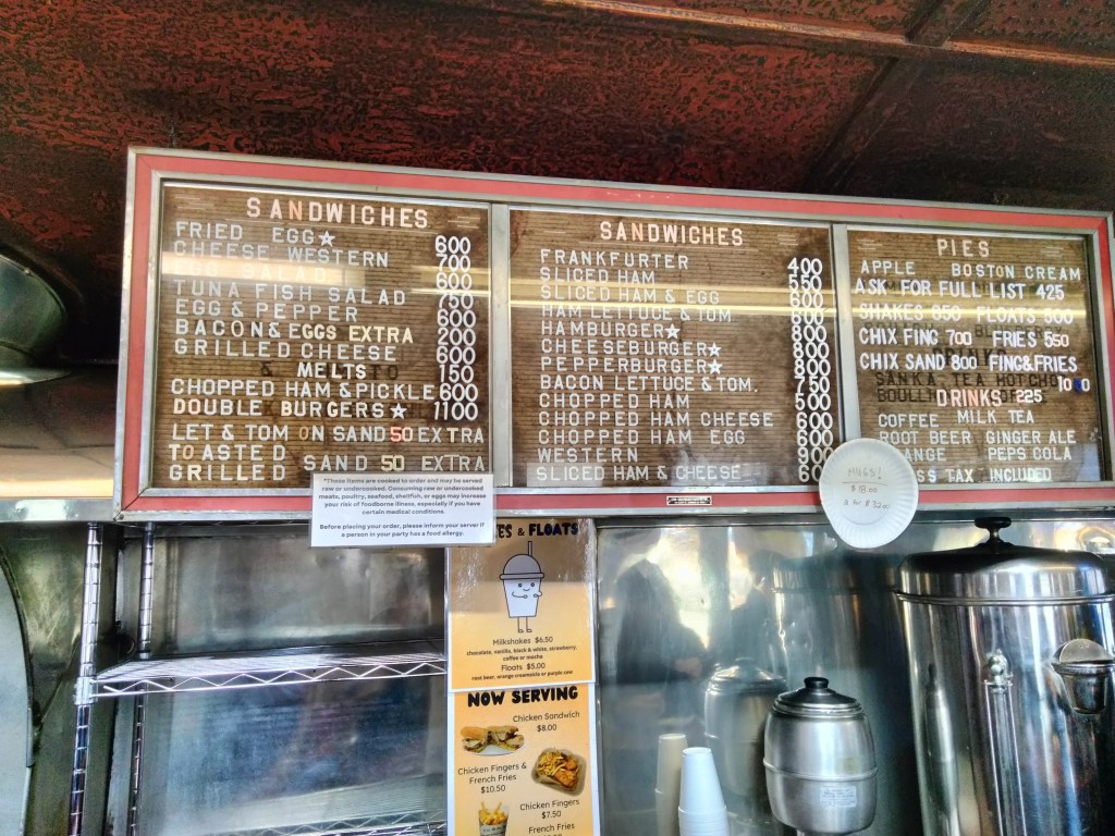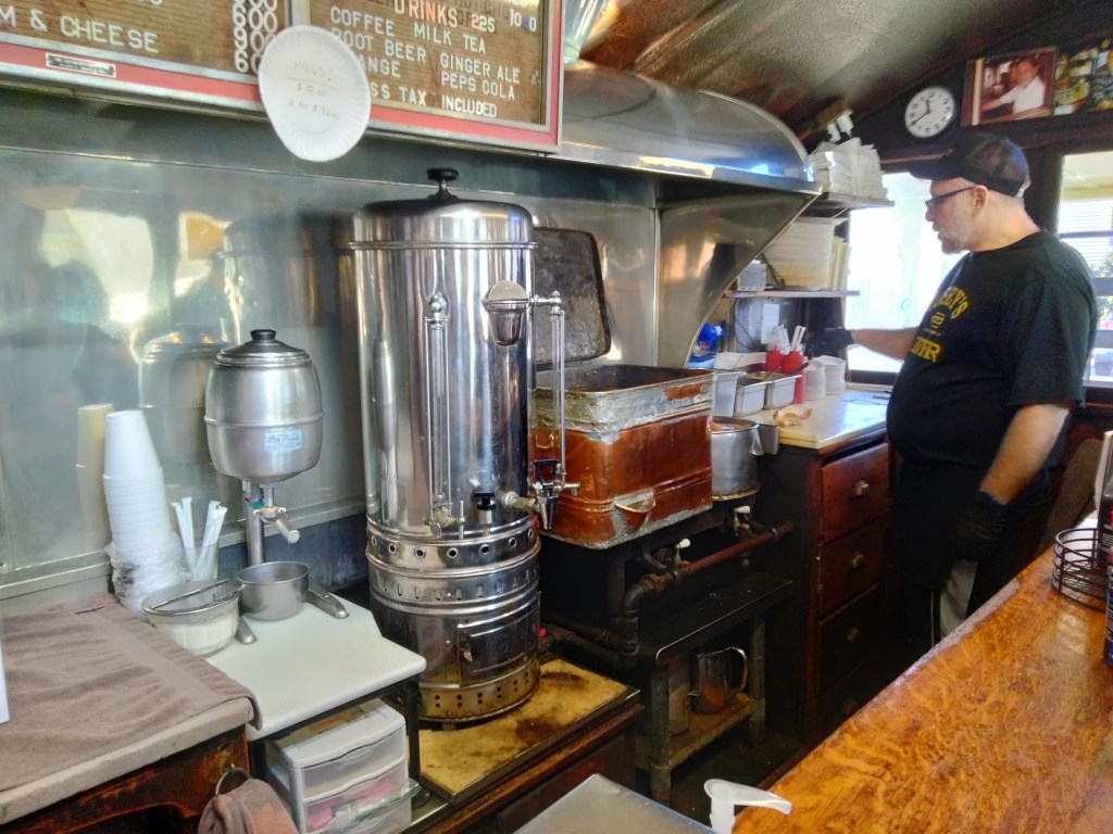 The tech is just as ancient as the diner. The tank that dispensed water used for tea and coffee was original to the diner. The copper tank where the hot dogs steamed was original to the food cart from 1890. It looked the part.