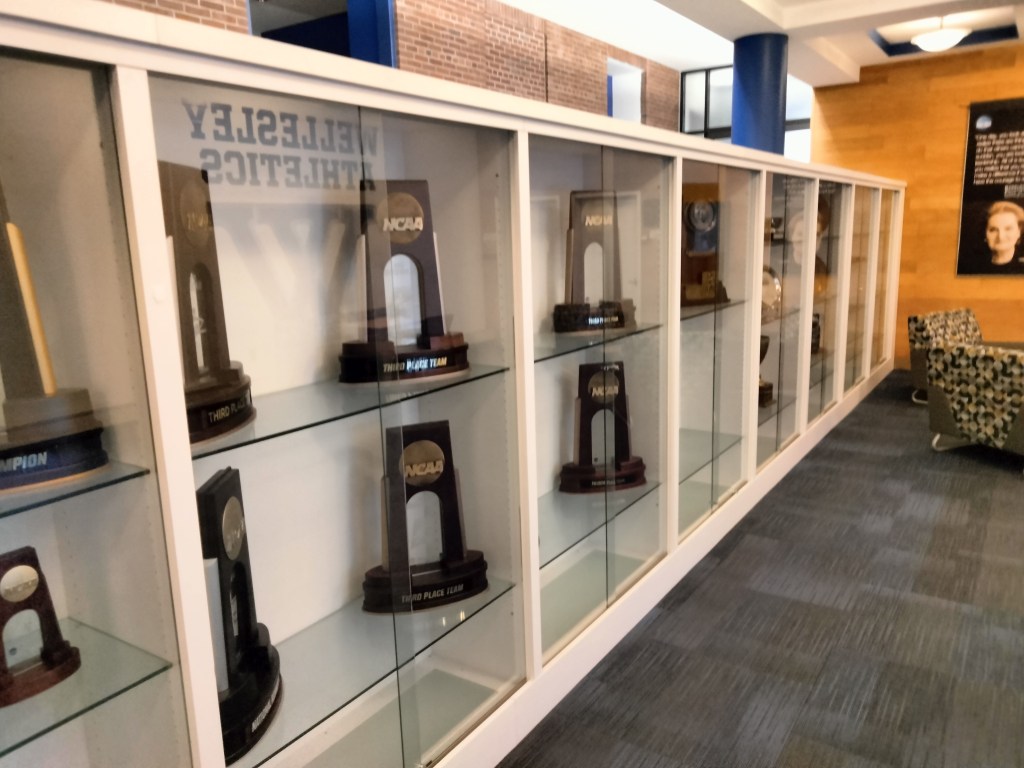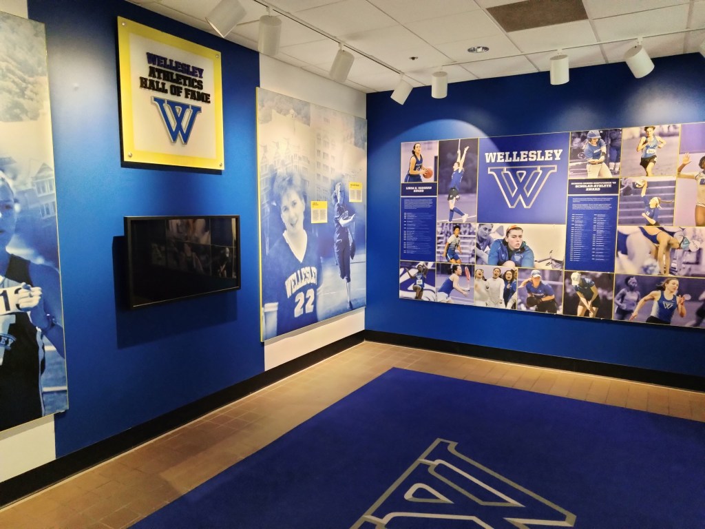 Through the doors on the way down the ramp into the fieldhouse is the Wellesley hall of fame, resplendent in blue.