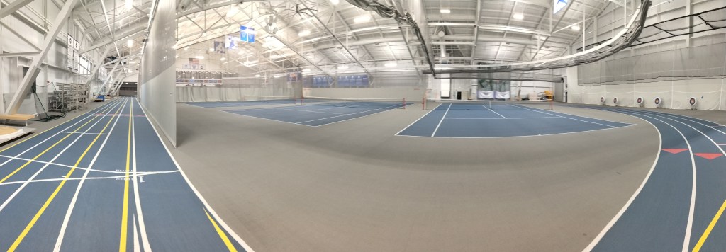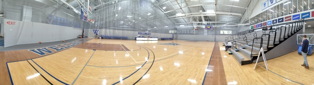 This is not a gym here at Wellesley. The court fits snugly between one of the turns of the indoor track and is curtained off to provide some sense of intimacy and to give shooters a background to shoot at.