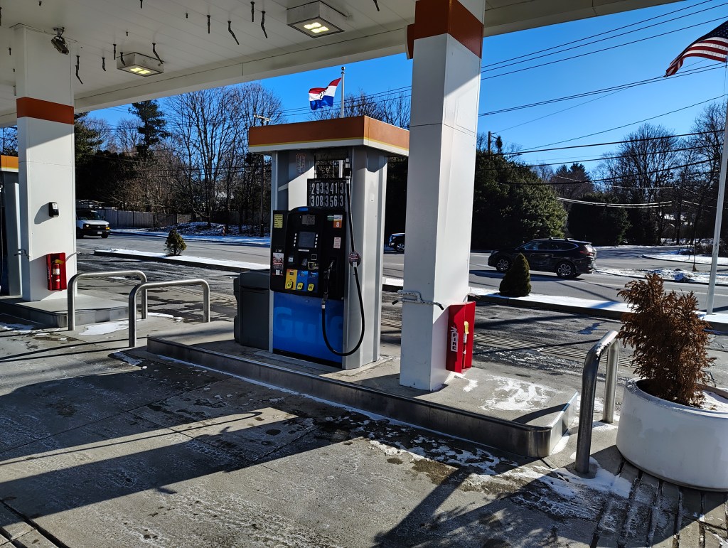 Frontage that looks like any other townie gas station in Massachusetts. Turn around and it’s $2.93 for a gallon of regular.