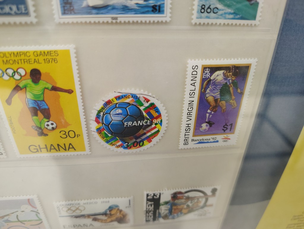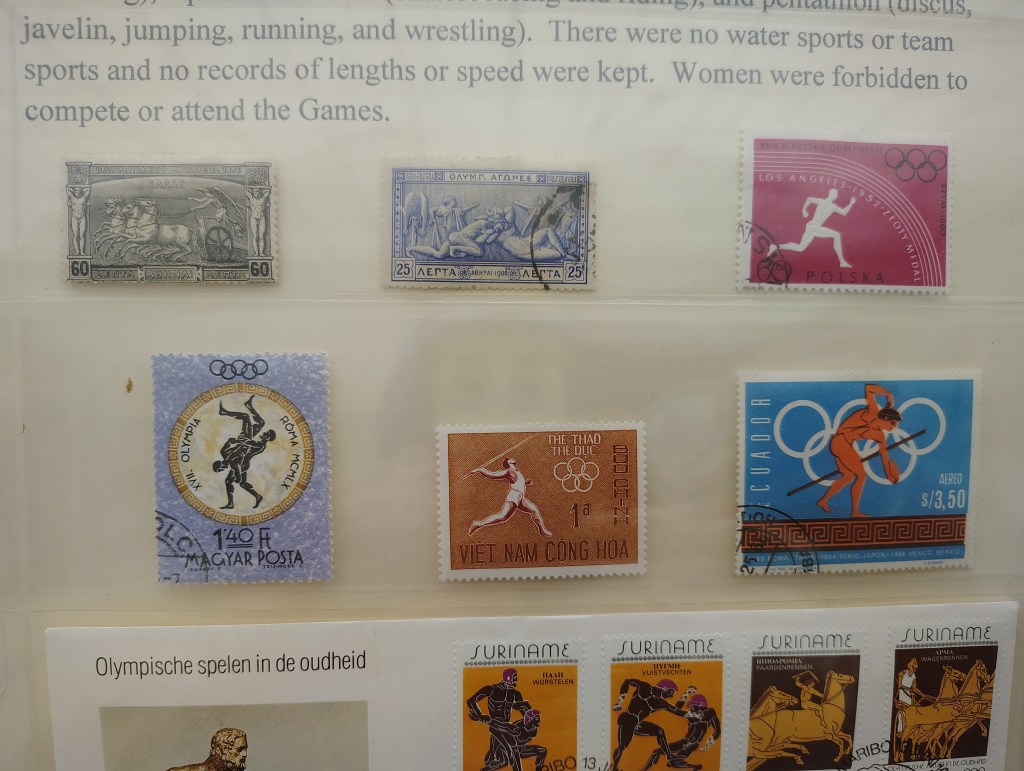 The back of the room had a large section dedicated to stamps from around the world for Olympic games.